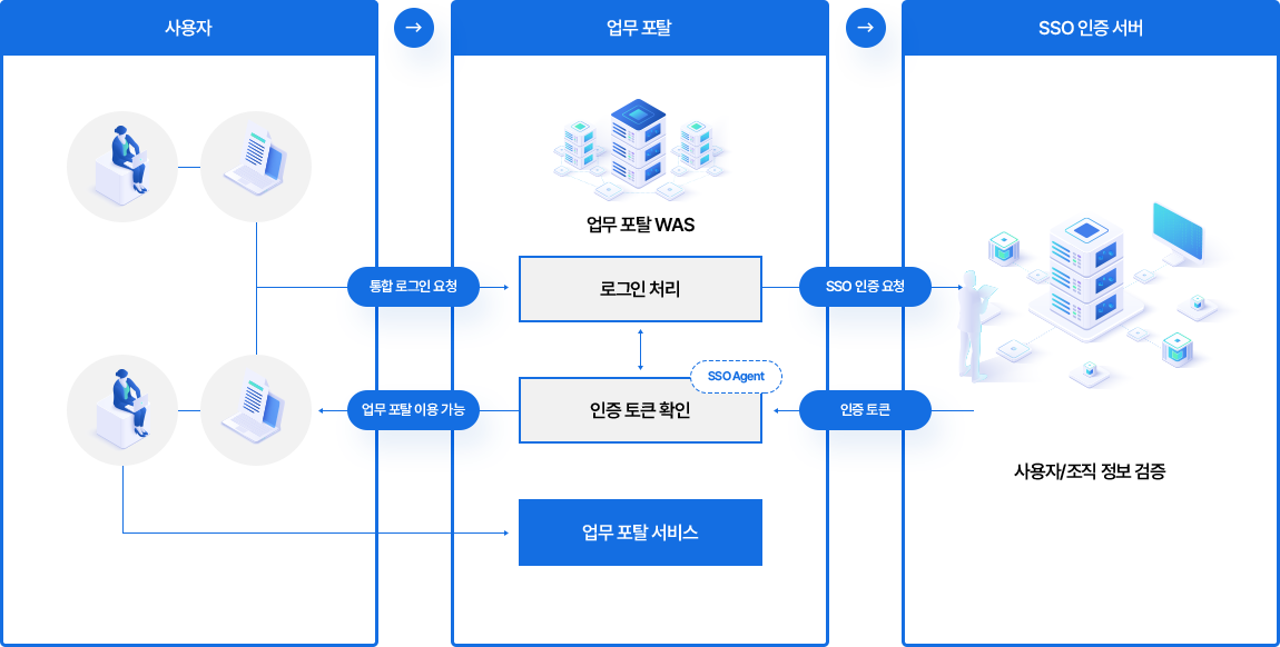한 번의 로그인(인증)으로 기업의 모든 사이트에 접속할 수 있는 통합인증(SSO) 기능으로